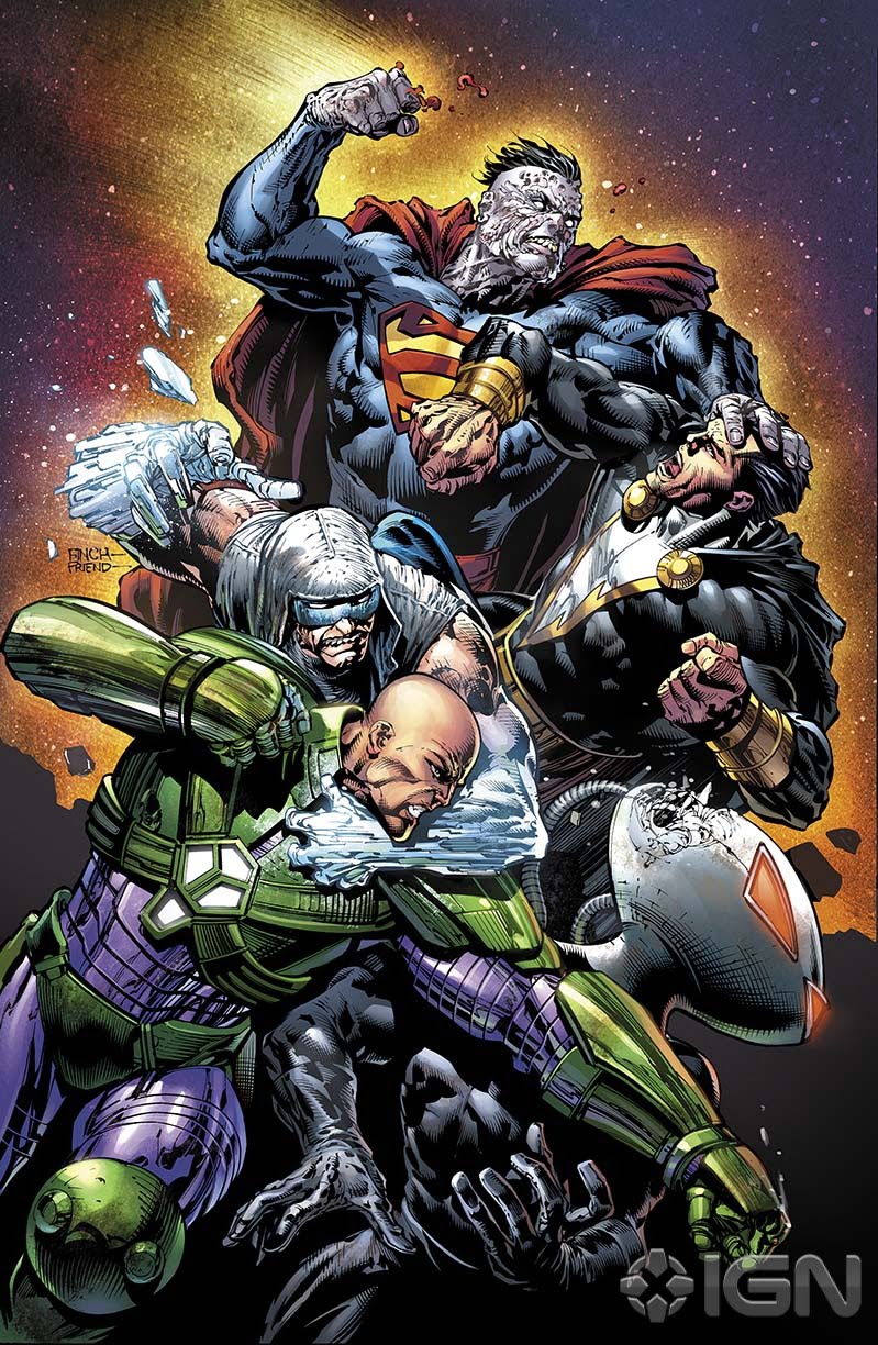 Geoff Johns is crafting a fantastic melding of the DC universe as they deal with this all-encompassing threat to life as they know it. While I haven’t been reading the add-ons, tie-ins, specials, etc I can say that this event feels like it will have impact and change throughout the future. Lex Luthor breaks out his Bizarro clone and his trusted green and purple Power Rangers/Transformer suit. Meanwhile Batman has survived and, along with Catwoman, totes the scrapheap of what’s left of Cyborg to his father and Dr Morrow to fix. News of Nightwing’s public unmasking reaches Bruce as the Titans plan to rush headlong to retrieve their friend. Lex also starts to unravel the truth behind Ultraman and his weakness as Superwoman and Owlman scheme behind his back. SPOILER ALERT: She’s preggers and it ain’t Ultraman’s! Oh Snap! While these cracks and fissures in the Crime Syndicate start popping up already, it feels somewhat rushed and purposeful to already set up the weaknesses and break points that will eventually destroy the evil Justice League. At the end, we’re left with a pretty formidable force in itself. We’ll see if they can bring Black Adam back from that whoopin’ he took from Ultraman and stage a resistance with Batman, the doctors, Catwoman, and hopefully Cyborg.