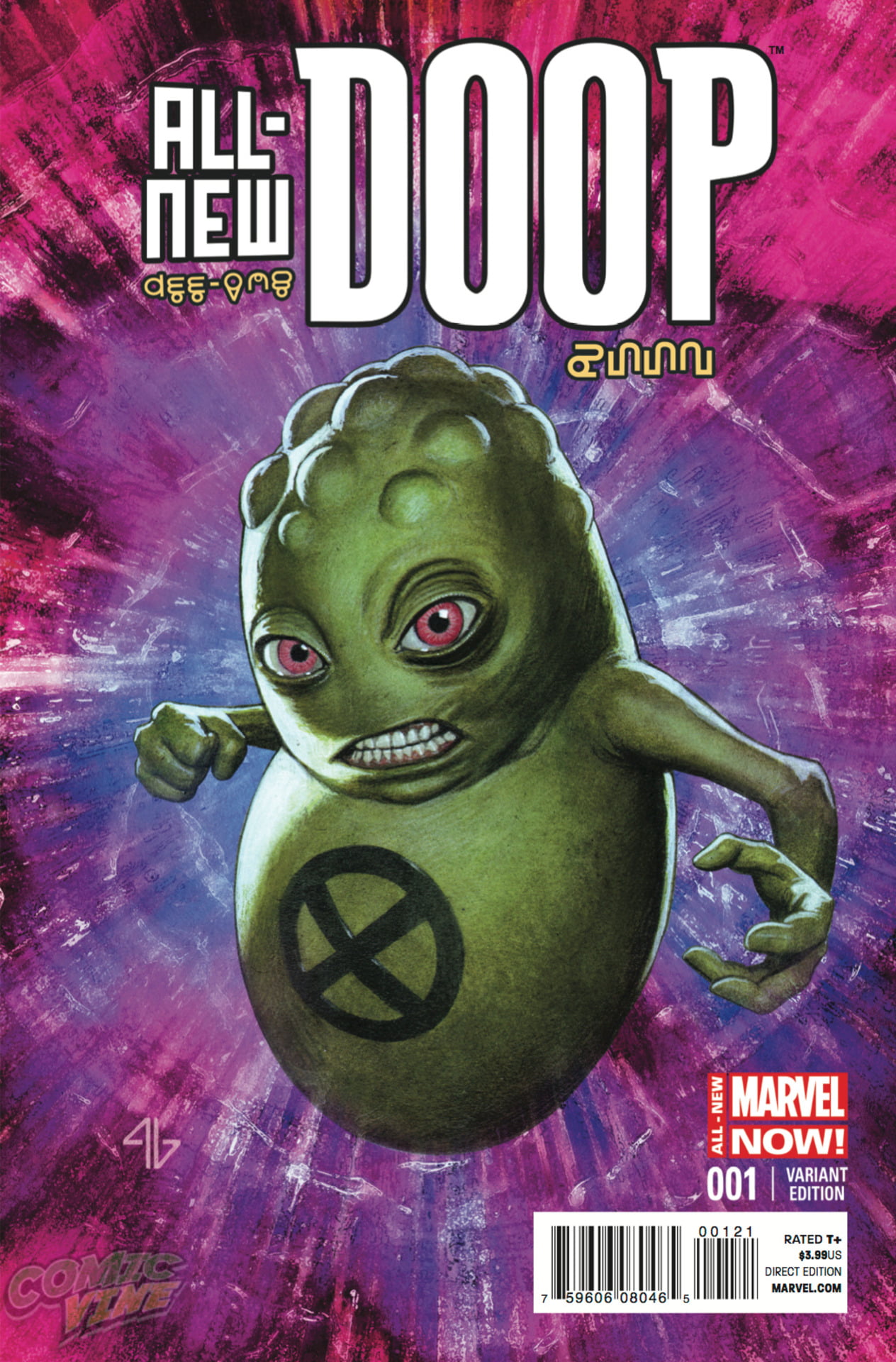We follow Doop thru one the mutants’ biggest storylines recently focusing mostly on Battle for the Atom as he skulks around in the background as a “marginal character”. It feels like that issue of X-Men Legacy where we were introduced to that mutant who everyone completely and totally forgot existed as soon as he was out of sight. Just not as good. That issue was full of detailed emotional exposition and plenty of introspective contemplation while this issue about Doop is just there. Much of Doop’s purpose is implied and I don’t feel like it’s given enough history or details for the reader to determine what exactly he’s supposed to be doing. In one instance he’s recording a battle. In another he’s motivating a healer to fix an injured Cyclops which I’m sure any other X-Man could’ve done. In another part of the story he’s travelling between stories witnessing another argument between the mutants. Then he reaches into himself and…well…that’s it. He doesn’t pull anything out. It just moves to a new part of the story. Maybe he was pulling his “sleeve” up to look at his watch. I don’t know if that was something that went over my head or something that will impact the story later or what. That’s my complaint about this 1st Doop issue. I don’t know what in the hell is going on. I’m confused but not in a cool, mysterious, mad genius with a master plot, kind of way. I’m just really confused. At the end we find out that he’s in love with Kitty Pryde and wants to marry her. At her complaints that they can’t even have a conversation much less get married, the little green booger turns himself inside out, literally. And then he speaks English?! At first I thought he was gonna rock the Yoda speech for a second there but no. Anyway, at least he can talk now so maybe his story will make more sense to me. I actually am looking forward to figuring out just what the hell Doop is.