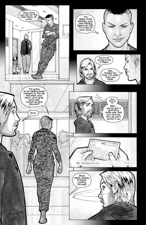 The art in this book is beyond unique. It’s like nothing in my collection, past, present, or future. Even though it’s black and white, the fact that it doesn’t have any color never takes away from the series. In fact, it adds. Especially in military complexes and labs and the like. The stark, emptiness of the backgrounds help illustrate the major differences between Dr. Loren and the military industrial complex. There are also a ton of details and emotions on the characters’ faces. The scene where the Navy SEAL strangles his wife in bed is especially hard to view given the anger and pure rage on his face, juxtaposed with the sheer terror on his wife’s face is chilling. The art style is different from anything on the shelves and I could see this guy drawing cartoons for Nickelodean.