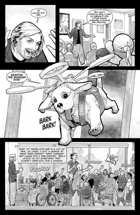 In this book, David takes himself and his roomate’s pet down a zero gravity chamber for shits and giggles I guess. I assume it was for the cancer patients he gives a preview of the video to on the following pages. He shows these kids the video of him and his dog and then proceeds to tell them about his new weaponized Space Puppy. Sarcastically of course. This issue is full of emotional stuff like this and explores the inherent kindness in the heart of this kid prodigy who ended up making weapons instead of helping people. He gets his chance in this story as one of his only friends in the world show up in handcuffs. One of the Navy SEALS who saved Dr. Loren once in the series had an episode of PTSD due to an actual physical brain injury. He violently killed his wife during a night terror while she tried to wake him up. David identifies the injury and cures the hell out of it like he always does. Using a genetic targeting system he designed to kill, David intends to cure PTSD before Petty Officer Morgan is sent to military prison for life. Specifically targeting people would indeed help with curing all forms of brain injury since everyone’s brain is different in every conceivable and inconceivable way. The ending is an emotional shocker I won’t give away just in case someone hasn’t read it and may in the future. It’s a good one.